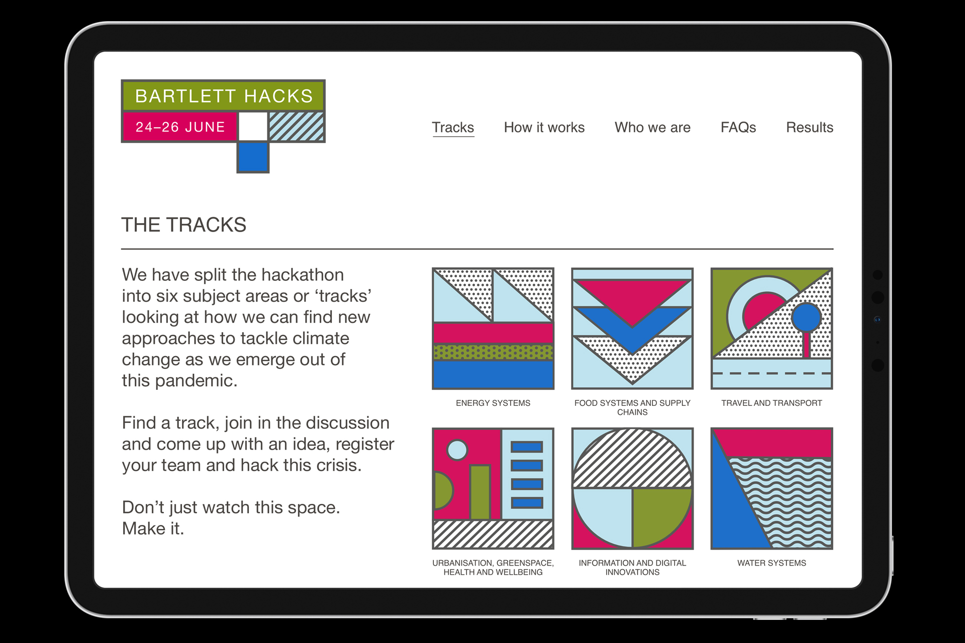 The coronavirus outbreak has managed to transform our lives in the blink of an eye. Across the world, the responses and innovative solutions being demonstrated are inspiring. With that in mind, The Bartlett planned to host an online open hackathon looking for lasting climate solutions that might built a better, healthier future for everyone. We worked to their ambitious schedule to design an identity and website before the end of the academic year, ensuring maximum student engagement.