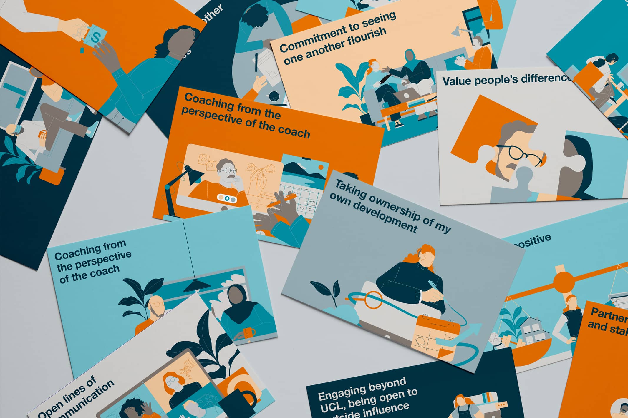 These online and face-to-face learning experiences contribute to the UCL mission by providing the opportunities and tools to support leaders, staff, and research students develop professionally and build careers. We partnered with illustrator Niamh Power to create a visual language and suite of assets to promote the Leadership Programmes.